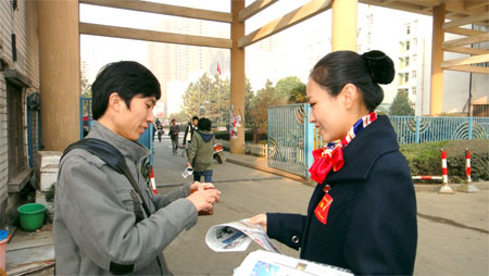 武職空乘專業(yè)學生賣報獻愛心 本網(wǎng)訊 2010年12月5日,武漢職業(yè)技術(shù)學院空中乘務(wù)專業(yè)10級學生和國際日語10301班學生為幫助貴州貧困地區(qū)學生,特舉行了義賣報紙籌捐活動。