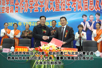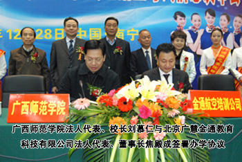 本網(wǎng)訊:伴隨著新年的鐘聲,在2011年即將渡過之際的12月28日,廣西師范學(xué)院文星樓報告廳充滿了節(jié)日的喜慶氣氛。在這里,廣西師院與北京廣慧金通教育科技有限公司舉行了合作辦學(xué)簽字儀式暨招生考試信息發(fā)布會。廣西師范學(xué)院黨委書記劉力、院長劉慕仁,北京廣慧金通教育科技有限公司董事長兼總經(jīng)理焦殿成、副總經(jīng)理兼院校教學(xué)工作部總經(jīng)理盛美蘭,以及受邀參加的中國南方航空、中國東方航空、廈門航空、深圳航空、長榮航空等各航空公司領(lǐng)導(dǎo)蒞臨觀摩了本次簽約儀式。廣西師范學(xué)院各部門領(lǐng)導(dǎo)以及09、10級新聞傳播學(xué)院的近300名師生列席了簽約儀式。簽約儀式由廣西師范學(xué)院黨委副書記、紀(jì)委書記梁半農(nóng)主持。 廣西師范學(xué)院與北京廣慧金通教育科技有限公司合作開辦的播音與主持藝術(shù)(空中乘務(wù)方向)專業(yè),是廣西自治區(qū)高校中唯一招收空中乘務(wù)藝術(shù)類本科的專業(yè),填補了廣西壯族自治區(qū)在本科學(xué)歷層次空乘人才培養(yǎng)上的空白。而對于“學(xué)高為師,身正為范”的師范類院校來說,肩上重任更是非同一般。廣西師范學(xué)院,自1953年建校以來,就始終秉承著“德才并育,知行合一”的校訓(xùn),厚德載物,迅猛發(fā)展。 簽約儀式開始,梁半農(nóng)副書記宣讀了廣西壯族自治區(qū)教育廳關(guān)于廣西師范學(xué)院與北京廣慧金通教育科技有限公司合作辦學(xué)的批文。 隨后,廣西師范學(xué)院法人代表、校長劉慕仁與北京廣慧金通教育科技有限公司法人代表、董事長焦殿成簽署辦學(xué)協(xié)議。 廣西師范學(xué)院招生就業(yè)處陳宗武處長詳細(xì)地介紹了空乘專業(yè)的學(xué)科建設(shè)、發(fā)展、招生情況、招生原則、招生計劃、報告條件及報考須知等情況。 劉力書記代表廣西師范學(xué)院對出席本次儀式的嘉賓表示熱烈歡迎。劉力書記指出,與金通航空培訓(xùn)聯(lián)合開辦本科層次空乘專業(yè),這是符合雙方及中國民航業(yè)發(fā)展需要、開拓創(chuàng)新、搶抓機(jī)遇的科學(xué)決策;是充分發(fā)揮各處資源優(yōu)勢,實現(xiàn)雙方互惠共贏的先進(jìn)意識,進(jìn)一步拓寬學(xué)校人力物力資源渠道、增強學(xué)校在社會的影響力。他希望此次校企合作,雙方應(yīng)秉承真誠合作、互利互惠、共同發(fā)展的原則,共同努力、共同見證空乘專業(yè)的成長和壯大,把空乘專業(yè)發(fā)展成為我校及廣西高校的品牌專業(yè)。 董事長焦殿成在簽約儀式上致辭。他說,廣西是美麗的八桂之地,奇特的喀斯特地貌,燦爛的文物古跡,濃郁的民族風(fēng)情,使廣西獨具魅力!作為全國重要僑鄉(xiāng)、祖國的南大門,也是連接我國與東盟國家的橋頭堡,特殊的地形地貌和豐富的旅游資源為民航業(yè)的發(fā)展提供了優(yōu)越的條件。廣西壯族自治區(qū)現(xiàn)有8個民用機(jī)場,已經(jīng)開辟了約170條航線,共有34家國內(nèi)外航空公司進(jìn)駐廣西市場,航線網(wǎng)絡(luò)通達(dá)國內(nèi)多個發(fā)達(dá)地區(qū)和港澳臺地區(qū),覆蓋除文萊以外的其他東盟國家。而“十二五”時期,廣西提出了實現(xiàn)“富民強桂”的跨越目標(biāo),將繼續(xù)把民航建設(shè)放在交通建設(shè)的突出位置,計劃投入170億元建設(shè)15個重大民航項目。面對祖國民航業(yè)快速發(fā)展的有利契機(jī),校企之間真誠合作,攜手培養(yǎng)民航業(yè)發(fā)展所需要的高端人才,將是高等院校和企業(yè)科學(xué)發(fā)展的的必由之路、創(chuàng)新之路和希望之路。 “十年樹木百年樹人”,作為肩負(fù)著國家科學(xué)發(fā)展基礎(chǔ)性工程的高等院校,在人才培養(yǎng)上更應(yīng)首當(dāng)其沖、責(zé)任重大。北京廣慧金通教育科技有限公司與廣西師范學(xué)院采用校企合作辦學(xué)模式,共同開辦本科層次的播音與主持藝術(shù)專業(yè)(空乘與禮儀方向),是合作雙方認(rèn)真考察、縝密調(diào)研、履行正規(guī)批報程序所做出的科學(xué)決策。合作期限為8年,目標(biāo)和思路明確,權(quán)利和義務(wù)清楚,職責(zé)和任務(wù)具體。該專業(yè)為全日制藝術(shù)類本科,標(biāo)準(zhǔn)學(xué)制四年。總體構(gòu)想是:充分發(fā)揮校企雙方的資源優(yōu)勢,立足廣西,輻射西南,服務(wù)全國,努力為祖國民航業(yè)選拔、培養(yǎng)、輸送合格的空乘人才和管理人才,真正使廣西師范學(xué)院播音與主持藝術(shù)(空中乘務(wù)方向)得到科學(xué)和可持續(xù)發(fā)展。 廣西師范學(xué)院與北京廣慧金通教育科技有限公司成為理想的合作伙伴,是合作雙方進(jìn)行科學(xué)考察調(diào)研的理性選擇。廣西師范學(xué)院是一所辦學(xué)歷史悠久、教學(xué)資源豐富、在廣西乃至全國有一定影響力的高水平院校。我們與廣西師范學(xué)院合作開辦的播音與主持藝術(shù)(空中乘務(wù)方向),培養(yǎng)多民族的空乘人才,即發(fā)揮了雙方的資源優(yōu)勢,同時也使善良淳樸的壯、漢、瑤、苗等12個世居民族的子孫后代走向國際、國內(nèi)高端服務(wù)和管理崗位,這是利于當(dāng)今、著眼未來、功在長遠(yuǎn)的千秋偉業(yè)。我們將真誠地與廣西師范學(xué)院一道,遵循民航空乘人才的培養(yǎng)
