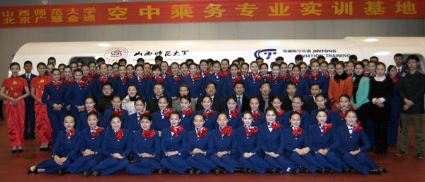焦殿成董事長(zhǎng)在致辭中,首先代表北京廣慧金通教育科技有限公司,熱烈歡迎各位懷揣藍(lán)天夢(mèng)想的莘莘學(xué)子,來(lái)到山西師范大學(xué)空乘專業(yè)求學(xué)深造。同時(shí),對(duì)山西師范大學(xué)的各級(jí)領(lǐng)導(dǎo)和職能部門所給予“金通航空培訓(xùn)”的信任支持表示誠(chéng)摯的感謝!焦總講到:山西師范大學(xué)始終把教學(xué)質(zhì)量作為立校之本,以學(xué)科建設(shè)為龍頭,不斷深化教學(xué)改革,強(qiáng)化教學(xué)管理,是一所文理并重、學(xué)科齊全、治學(xué)嚴(yán)謹(jǐn)、基礎(chǔ)扎實(shí)、國(guó)內(nèi)一流的綜合性師范大學(xué)。2011年12月30日,校企雙方本著合作共贏、創(chuàng)新發(fā)展的科學(xué)理念,簽定了為期8年的《合作辦學(xué)協(xié)議》,共同邁出了校企合作發(fā)展的堅(jiān)實(shí)一步,F(xiàn)在,已經(jīng)招生兩屆共計(jì)562名學(xué)生,其中:大一學(xué)生207名(一本),大二學(xué)生355名(一本218名,三本137名)。尤其是隨著校企合作的逐步深入,貴我雙方審時(shí)度勢(shì)、共同努力,在2013年拓展了招生層次與規(guī)模,啟動(dòng)了本科二批C類(三本)招生,實(shí)現(xiàn)了空乘專業(yè)在本科層次上招生范圍的全覆蓋,這是校企合作實(shí)現(xiàn)廣度發(fā)展的標(biāo)志,是校企合作項(xiàng)目走向深度融合的范例,更是校企雙方資源形成高度整合的典范。焦總強(qiáng)調(diào),隨著校企合作項(xiàng)目的實(shí)質(zhì)性展開,為了滿足空乘專業(yè)教學(xué)實(shí)訓(xùn)需要,合作雙方都極為重視空乘專業(yè)教學(xué)實(shí)訓(xùn)中心建設(shè)。山西師范大學(xué)充分利用各方面的資源和力量,盡最大努力完成了實(shí)訓(xùn)中心選址調(diào)配和改建裝修,為空乘專業(yè)教學(xué)管理工作奠定了良好基礎(chǔ)。作為真誠(chéng)的合作伙伴,我們?cè)谂鋫鋬?yōu)秀管理團(tuán)隊(duì)和專業(yè)教員、輔導(dǎo)員的基礎(chǔ)上,為空乘專業(yè)教學(xué)實(shí)訓(xùn)中心配置了具備客艙設(shè)備理論學(xué)習(xí)、客艙服務(wù)模擬訓(xùn)練等19項(xiàng)主要功能、具備客艙失密使用氧氣面罩訓(xùn)練等4項(xiàng)輔助功能的“民航乘務(wù)模擬訓(xùn)練艙”,配備了199架國(guó)內(nèi)外航空公司的所有機(jī)模,安裝了具有自主知識(shí)產(chǎn)權(quán)的民航乘務(wù)員CBT教學(xué)軟件,為提高教學(xué)培養(yǎng)質(zhì)量創(chuàng)造了必備條件。焦總指出,在校企合作辦學(xué)的發(fā)展歷程中,我們深切感到,山西師范大學(xué)各級(jí)領(lǐng)導(dǎo)和職能部門嚴(yán)謹(jǐn)務(wù)實(shí)、開拓進(jìn)取,體現(xiàn)了高水平的凝聚力和執(zhí)行力。山西師范大學(xué)教育技術(shù)與傳媒學(xué)院的領(lǐng)導(dǎo)和老師,愛(ài)崗敬業(yè)、求實(shí)高效,展現(xiàn)出旺盛的工作熱情和負(fù)責(zé)精神。為此,我們將在今后的合作辦學(xué)歷程中,堅(jiān)持校企合作辦學(xué)方向、增強(qiáng)校企合作友誼、保證校企合作成果,與山西師范大學(xué)緊密配合,攜手譜寫山西師范大學(xué)空乘專業(yè)建設(shè)與發(fā)展的新篇章!最后,焦總希望各位同學(xué):要牢牢把握民航業(yè)大發(fā)展的歷史機(jī)遇,充分利用山西師范大學(xué)教學(xué)設(shè)施優(yōu)良、文化氛圍濃郁、創(chuàng)新人才輩出、綜合實(shí)力雄厚、社會(huì)影響廣泛的優(yōu)越條件,有效借助“金通航空培訓(xùn)”的豐富資源所鋪就的就業(yè)成才之路,勵(lì)志勤勉,學(xué)業(yè)有成,事業(yè)有為,早日實(shí)現(xiàn)展翅藍(lán)天的夢(mèng)想!
