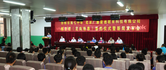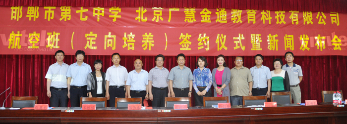 2015年5月29日上午,邯鄲市第七中學(xué)與北京廣慧金通教育科技有限公司航空班舉行了定向培養(yǎng)簽約儀式暨新聞發(fā)布會。北京廣慧金通教育科技有限公司董事長焦殿成一行、邯鄲市教育局副局長張長春、邯鄲機(jī)場管理有限公司總經(jīng)理秦建華、邯鄲市第七中學(xué)領(lǐng)導(dǎo)班子成員、全體老師、部分學(xué)生以及邯鄲市各大新聞媒體出席了本次簽約儀式。簽約儀式現(xiàn)場,孫校長、焦殿成董事長分別介紹了邯鄲市第七中學(xué)定向培養(yǎng)航空班的特點(diǎn)與優(yōu)勢。張局長代表教育局對邯鄲市第一個航空定向班正式簽約表示祝賀,對七中近兩年的發(fā)展給與了充分肯定,并對航空定向班的發(fā)展前景給予了高度的期許。