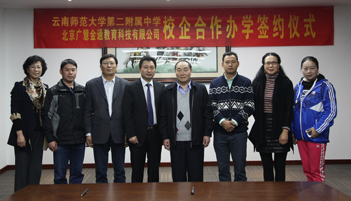 2015年4月9日,建立在校企合作、創(chuàng)新發(fā)展的基礎(chǔ)上,云南師范大學(xué)第二附屬中學(xué)與北京廣慧金通教育科技有限公司就聯(lián)合舉辦“校企合作(高中起點(diǎn))定向培養(yǎng)航空飛行員和乘務(wù)員、安全員”項(xiàng)目簽訂了《合作辦學(xué)協(xié)議》。在雙方的共同努力下,合作項(xiàng)目正式啟動(dòng)并順利實(shí)施,在逐步健全和完善校企合作機(jī)制上取得了實(shí)質(zhì)性進(jìn)展。云南師范大學(xué)第二附屬中學(xué)校長(zhǎng)袁德龍,校辦主任張慶岳,北京廣慧金通教育科技有限公司董事長(zhǎng)焦殿成,付總經(jīng)理付曉軍、公司高級(jí)顧問(教育部高校畢業(yè)生就業(yè)協(xié)會(huì)高?粘朔謺(huì)會(huì)長(zhǎng))王曉娟、公司就業(yè)部經(jīng)理馬強(qiáng)等領(lǐng)導(dǎo)出席了儀式。云南師范大學(xué)第二附屬中學(xué)校長(zhǎng)袁德龍、北京廣慧金通教育科技有限公司董事長(zhǎng)焦殿成代表雙方在合作協(xié)議上簽字。