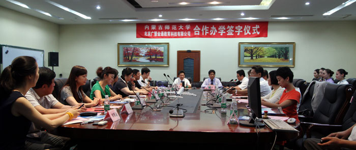 2015年7月23日,內(nèi)蒙古師范大學(xué)與北京廣慧金通教育科技有限公司在華北民航培訓(xùn)中心舉行了校企合作辦學(xué)簽字儀式。內(nèi)蒙古師范大學(xué)校長(zhǎng)云國(guó)宏,副校長(zhǎng)張海峰,旅游學(xué)院院長(zhǎng)郝志成,校辦公室主任霍日查,北京廣慧金通教育科技有限公司董事長(zhǎng)焦殿成,副總經(jīng)理郭文、王斌、劉旭、王艷霞等領(lǐng)導(dǎo)參加了此次簽約儀式。