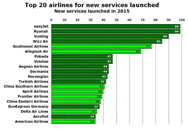 圖:2015年新增航線最多的前20家航空公司