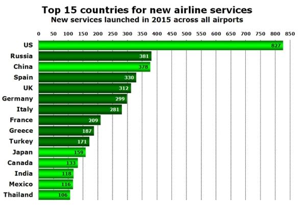 總體來看,2015年美國市場航線數(shù)量增長最多。美國航企開通了827條新航線,是緊隨其后的俄羅斯和中國的兩倍多。俄羅斯、中國、英國和西班牙的新增航線數(shù)量都在300-400條范圍內(nèi)。