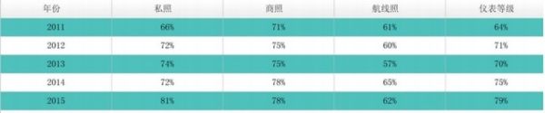 駕駛員理論考試歷年考試類型通過率對比,私照通過率在2015年有很大的提升,達(dá)到81%。