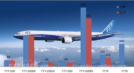 包含最新的777X,777項(xiàng)目總計(jì)獲得了來自70多家航空公司及飛機(jī)租賃商的1897架訂單,目前已經(jīng)交付了1401架。在這當(dāng)中777-300ER受到了航空公司熱捧,獲得了800架的訂單。