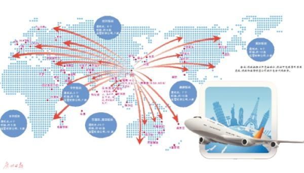 目前,從廣州的始發(fā)航線遍布五大洲,初步形成了以廣州為核心的全球網(wǎng)絡(luò)的覆蓋。由于廣州優(yōu)越的地理位置,尤其是飛往東南亞、南亞、中東、澳大利亞、新西蘭、非洲優(yōu)勢(shì)明顯、航線密集,所以從全國(guó)各地飛到廣州中轉(zhuǎn),再?gòu)膹V州飛境外的游客也越來(lái)越多,形成了一條國(guó)際化的“廣州之路”,廣州也成為了中國(guó)大陸面向澳新、東南亞和南亞的第一大門(mén)戶(hù)樞紐。