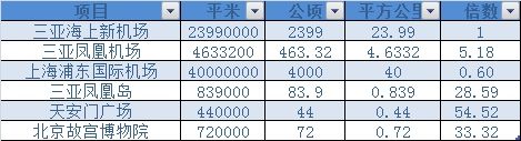 根據(jù)2015年三亞市政府披露的《政府工作報(bào)告》,三亞海上新機(jī)場(chǎng)項(xiàng)目項(xiàng)目用海面積約29.95平方公里,陸域形成面積為23.99平方公里,工程區(qū)域內(nèi)規(guī)劃有4條跑道,3座航站樓以及相應(yīng)的配套輔助區(qū)。編輯稍微做了下對(duì)比計(jì)算,三亞海上新機(jī)場(chǎng)填海項(xiàng)目陸域面積大概是天安門廣場(chǎng)的54.52倍,三亞目前鳳凰機(jī)場(chǎng)的5.18倍,上海浦東國(guó)際機(jī)場(chǎng)的0.6倍,三亞鳳凰島項(xiàng)目的28.59倍,北京故宮的33.32倍。