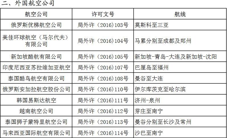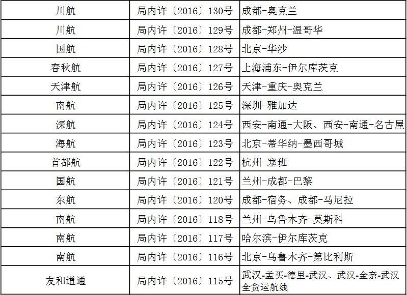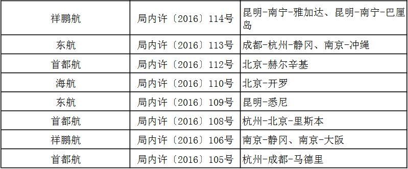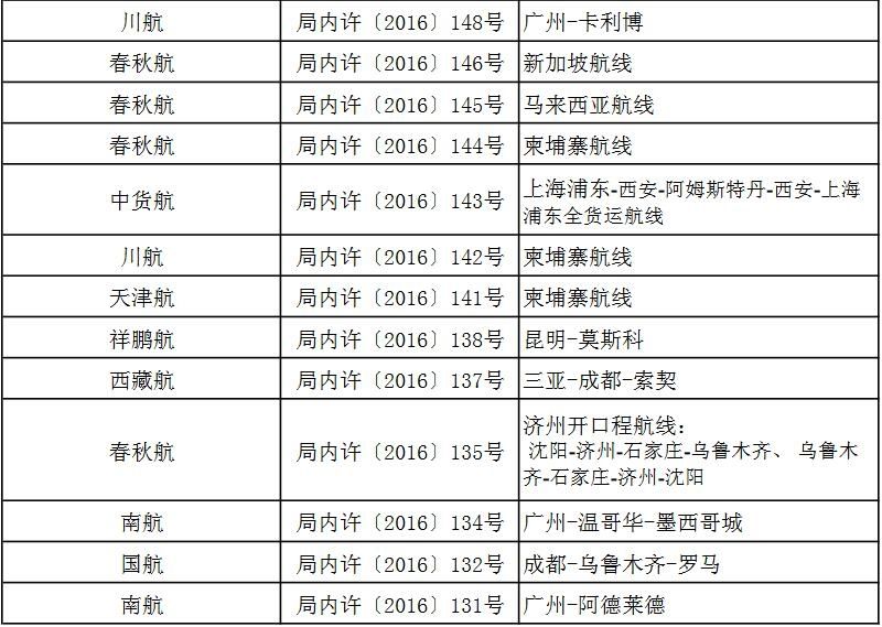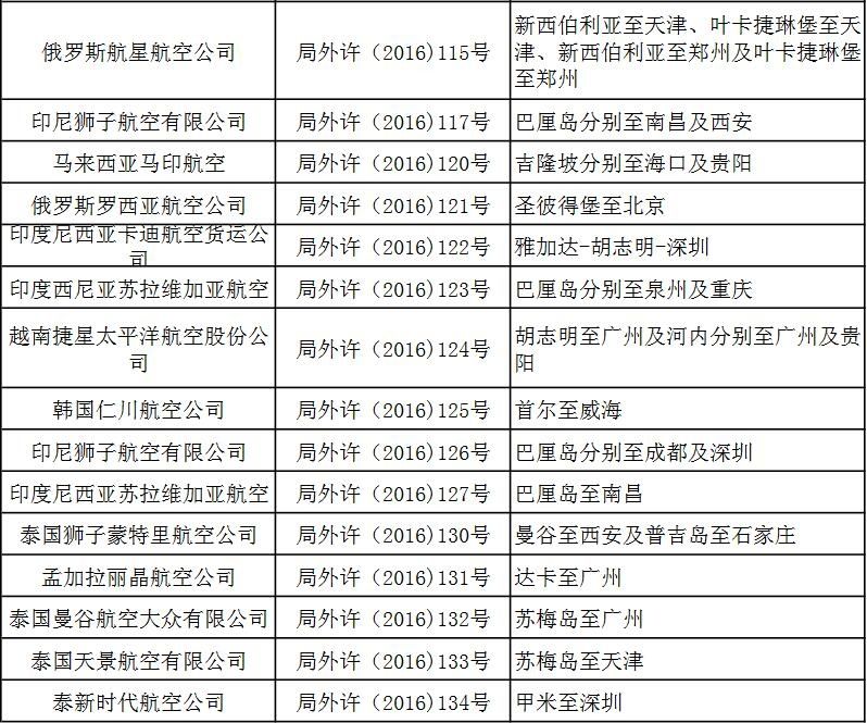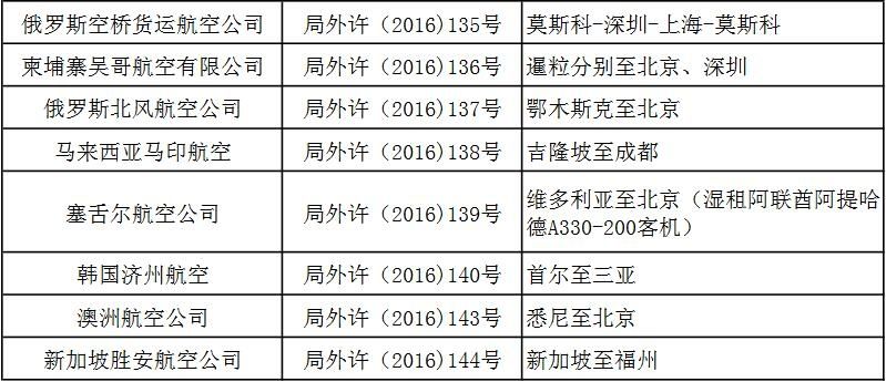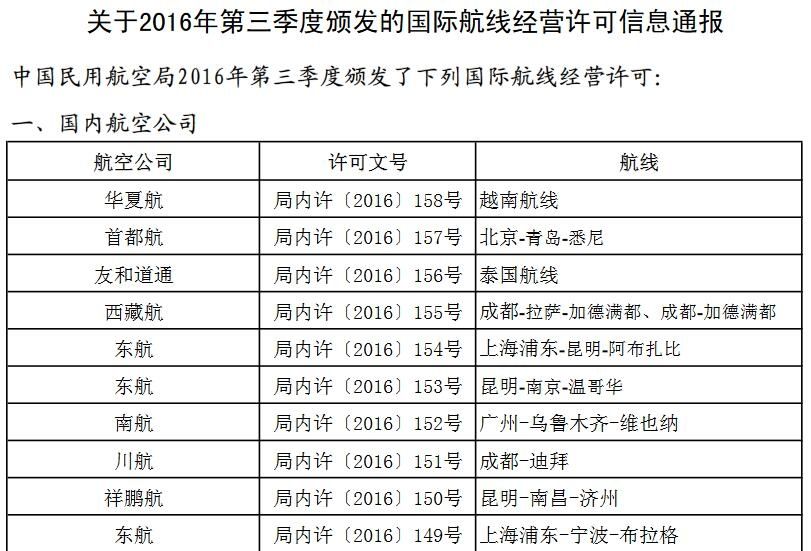 附件:關于2016年第三季度頒發(fā)的國際航線經營許可信息通報