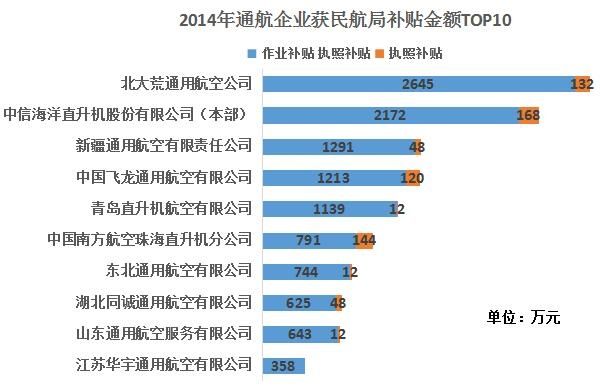 2014-2016年三年來,獲得補(bǔ)貼金額總計(jì)最多的10家通航企業(yè)分別為:北大荒通航、中信海直(本部)、飛龍通航、新疆通航、青島直升機(jī)、南航珠直、東北通航、山東通航、同誠通航、華宇通航。
