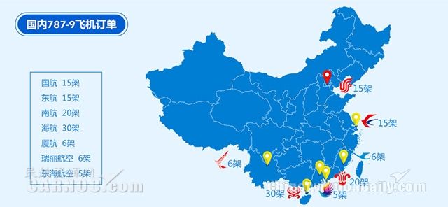 國航總計訂購了15架787-9飛機,海航訂購了30架,廈航6架。