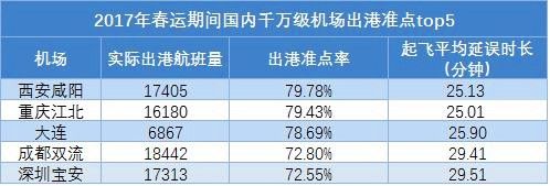 在機場出港準(zhǔn)點率方面,國內(nèi)千萬級機場準(zhǔn)點機場前3名分別是西安咸陽機場、重慶江北機場、大連機場,其起飛平均延誤時長均在25分鐘左右。值得注意的是,西安咸陽機場是繼2016之后再次摘得準(zhǔn)點冠軍,與去年同期相比,大連機場則是起飛平均延誤時長縮短最快的機場,縮短了近17分鐘。