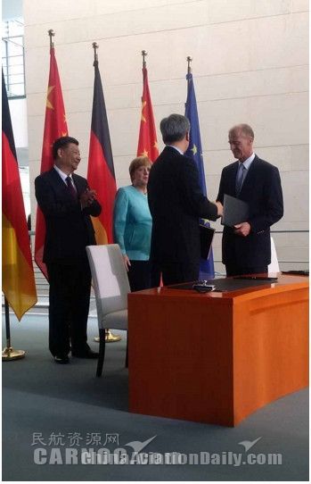 中國航空器材集團公司副總經(jīng)理孫博和空中客車公司首席執(zhí)行官托馬斯·恩德斯在協(xié)議上簽字。正在德國訪問的中國國家主席習近平和德國總理默克爾見證了協(xié)議的簽署。
